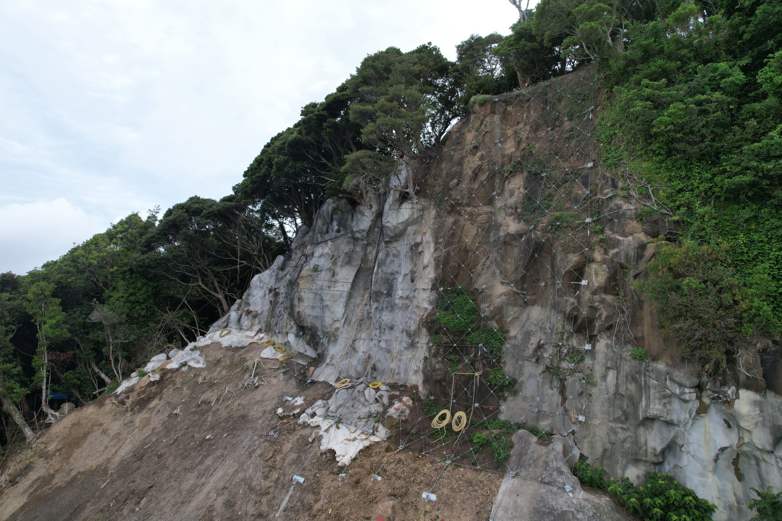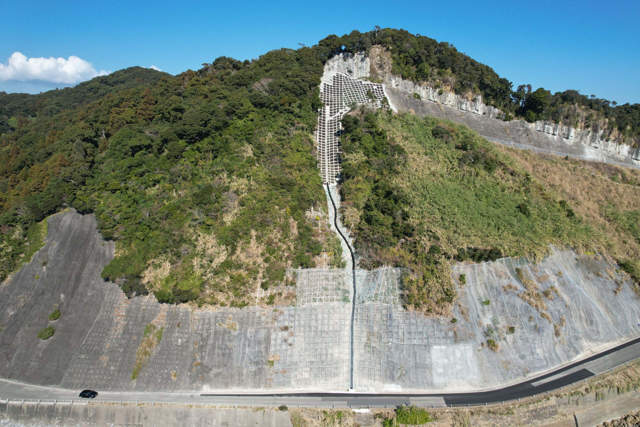 宮崎県日南市にて、災害復旧工事として落石防護網の設置を実施いたしました。急傾斜の岩盤露出箇所に対し、鋼ワイヤーネットを張り込んで落石を防止し、道路への落石リスクを軽減いたしました。